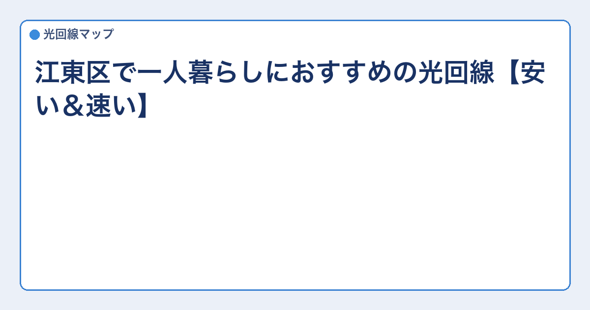 江東区で一人暮らしを始める方・すでに一人暮らし中で光回線を見直したい方へ。この記事では、東京都江東区で一人暮らしに合った光回線の選び方と、検討しやすいサービスを整理しています。 この記事のハイライト 江東区の一人暮らしで … 続きを読む